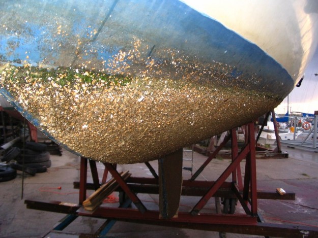 Łódkę wyciągnąłem z wody w październiku. Kadłub jak zwykle czysty (czyli bez porostów). Najbardziej mnie zawsze dziwi, że czysty jest nawet spód kila, malowany dopiero, gdy dźwig podniesie łódkę do góry przy wodowaniu