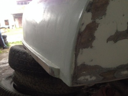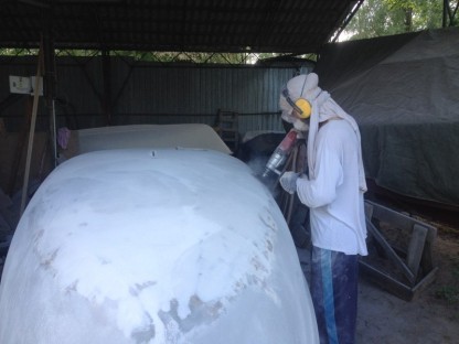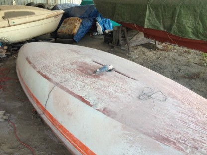 Potem łódka była przechowywana przez kilka kolejnych lat, aż w końcu pod wpływem nacisków ze strony Sylwii i mojego kumpla (tego samego) – wziąłem się do roboty. Przy łódce pracowaliśmy we dwoje – ja i Sylwia: jak ja pracowałem, to Sylwia robiła jedzenie, jak Sylwia pracowała – to robiłem je ja. I tym sposobem, mając zabezpieczone podstawy, szliśmy do przodu z pracami. Naprawiliśmy w dziesiątkach czy setkach miejsc pęknięcia laminatu, wzmacnialiśmy laminat w kilku miejscach, poprawialiśmy pawęż, potem – szpachlowaliśmy, szlifowaliśmy, i znów szpachla, znów szlif i tak nie raz i nie dwa… Większe ubytki szpachlowaliśmy topkotem, a „na gotowo” – szpachlówką epoksydową Sea Line.