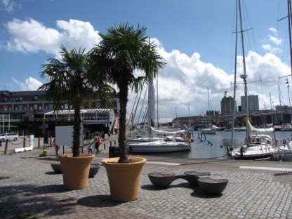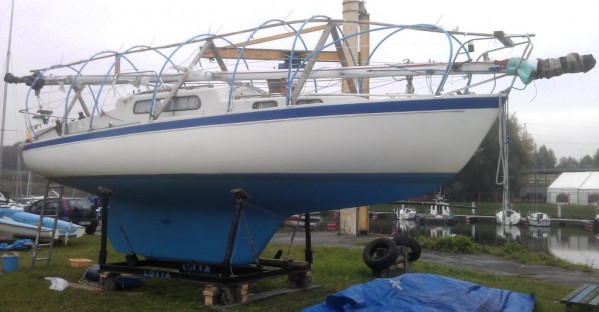 Niestety, nie mam bardzo dobrego obrazka porównawczego. Najlepszy, jaki udało mi się znaleźć, z jesieni 2013 – poniżej. Po wyciągnięciu jachtu z wody dno zostało tylko umyte myjką ciśnieniową (żeby usunąć szlam). Jest czyste. Ciemny pasek niewielkiego brudu na linii wodnej świadczy, że nie jest to dno świeżo malowane, a po całym sezonie na wodzie.