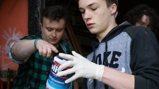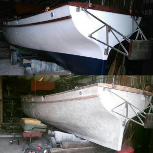 Najpierw zeszlifowaliśmy starą farbę w środku kadłuba oraz na zewnątrz. Następnie wygładziliśmy nierówności szpachlą, w niektórych miejscach koniecznie było położenie dwóch warstw szpachlówki. Potem, cała powierzchnia była wygładzona papierem ściernym o gradacji 180.
