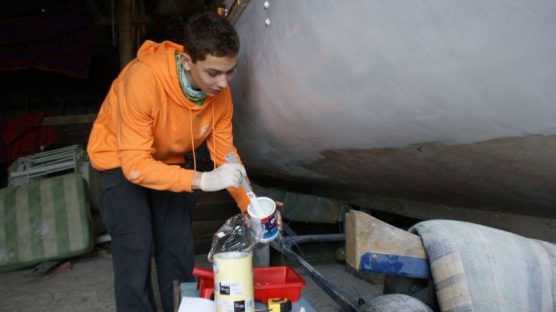 Po tej czynności pomalowaliśmy zewnętrzną górną część kadłuba łodzi (nie zjeżdżając do samego dołu, ponieważ tam miał być antyporost) farbą poliuretanową białą Emapur Marina. Farba była tak wydajna, że jedną puszkę zużyliśmy na pomalowanie dwóch warstw na jednej burcie i jedną warstwę do połowy na drugiej. Po pomalowaniu na zewnątrz dwóch warstw zaznaczyliśmy linię wody, aby oddzielić część, gdzie została położona farba poliuretanowa od części, na której miał znajdować się antyfouling.